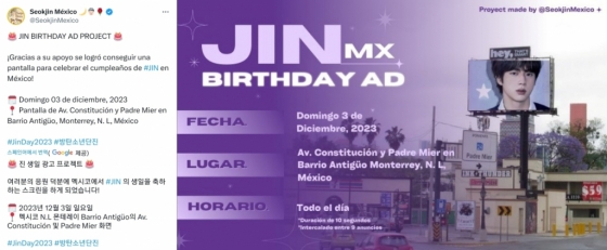 멕시코의 진 팬 베이스 Seokjin Mexico(@SeokjinMexico)는 현지 시간 12월 3일, 몬터레이에서 전광판 광고를 진행한다.