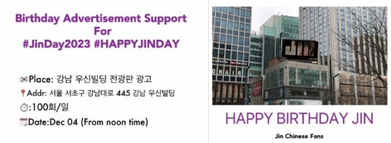 진의 중국팬들 ArmyJin_J1(@ArmyJin_J1)은 진의 생일 당일인 12월 4일 서울 강남 우신빌딩에서 전광판 광고를 서포트한다. ArmyJin_J1은 현지 시간 12월 3일부터 4일까지 뉴욕 타임 스퀘어에서 생일 축하 광고 영상도 송출한다.