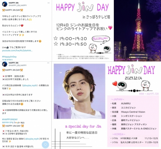 진의 일본 팬 계정 HAPPY JIN(@HAPPY_JIN_HAPPY)는 지난해에 이어 올해도 삿포로 TV 타워의 화려한 조명으로 진의 생일을 축하한다. 진의 생일 당일 오후 7시부터 유튜브로도 생중계된다.