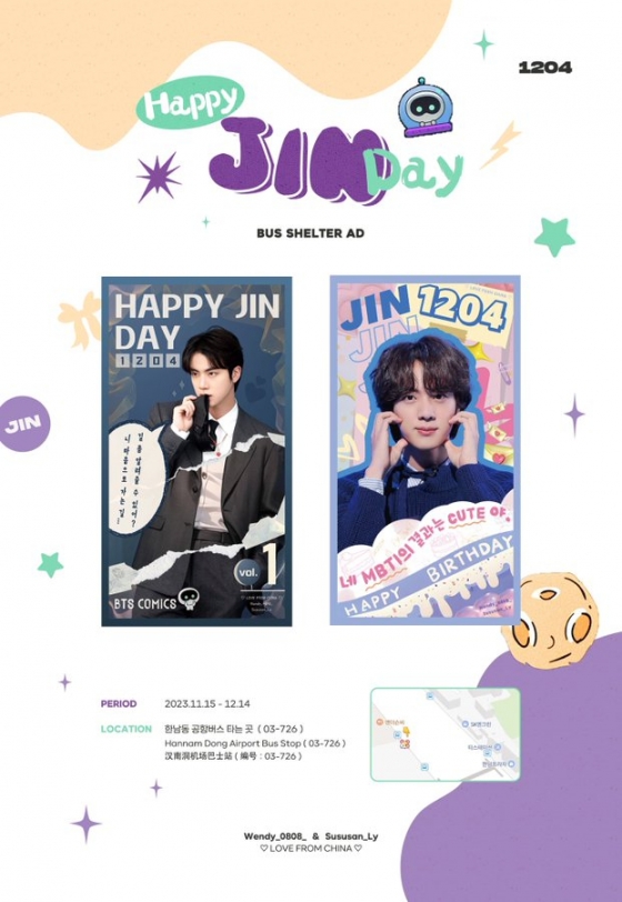 일본팬 Wendy(@Wendy_0808_)는 11월 15일부터 12월 14일까지 한남동 공항버스 정류장에서 진의 생일 축하 광고 서포트를 진행 중이다.