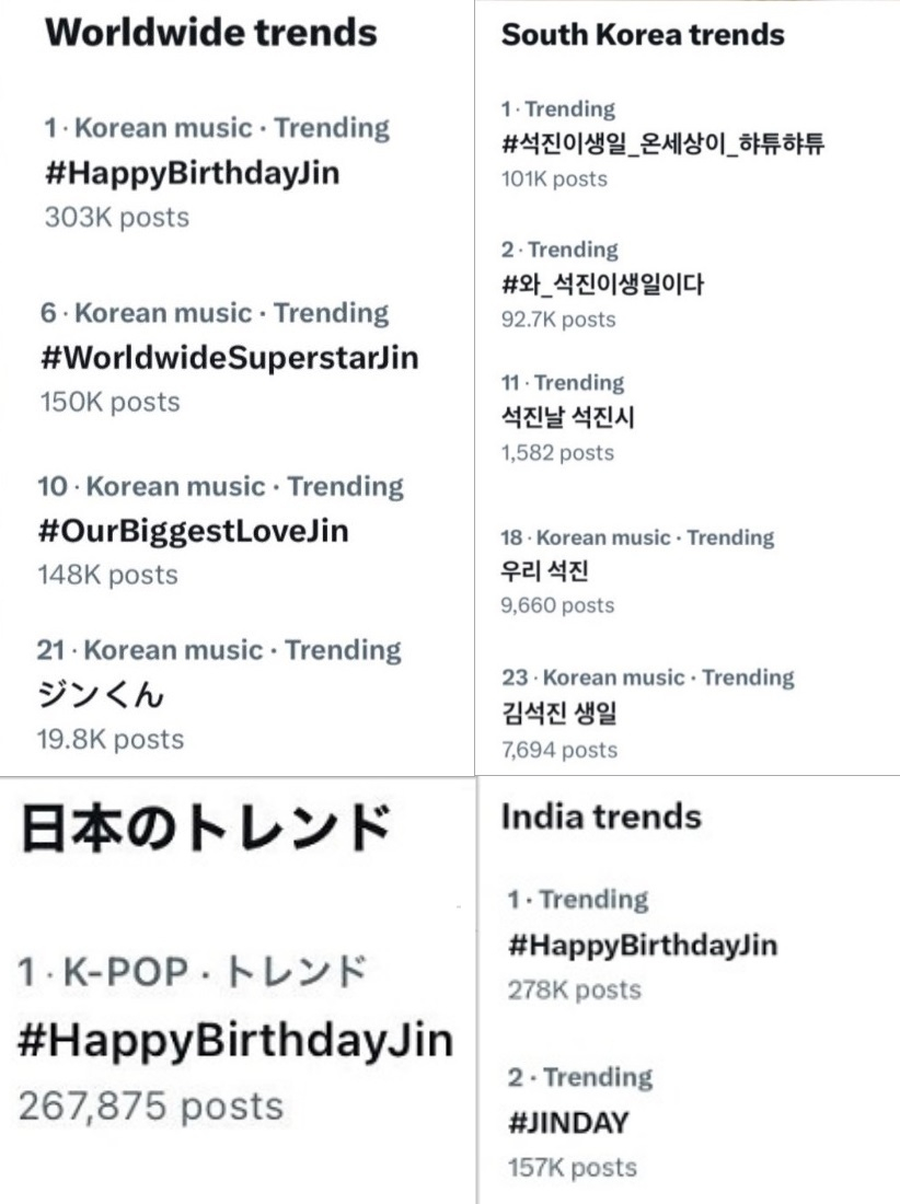 대표 글로벌 스타 진은 육군 현역 조교로 군복무 중임에도 전 세계 팬들로부터 뜨겁게 사랑받으며 역대급 생일 서포트가 계속되고 있다. 생일 전날인 3일 밤부터 내내 진의 생일을 축하하는 문구들이 트위터 월드와이드, 한국, 일본, 인도 등 세계 곳곳에서 실시간 1위와 상위권을 화려하게 장식했다.