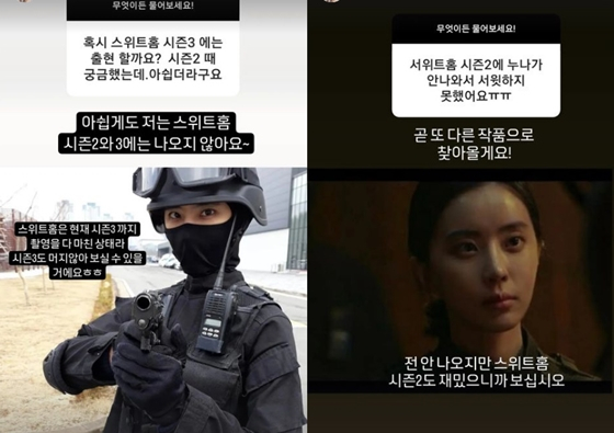 그는 또 다른 팬이 '스위트홈 시즌2에 누나가 안 나와서 스윗하지 못했어요'라고 하자 "곧 다른 작품으로 찾아올게요! 전 안 나오지만 스위트홈 시즌2도 재밌으니까 보십시오"라고 대답했다.