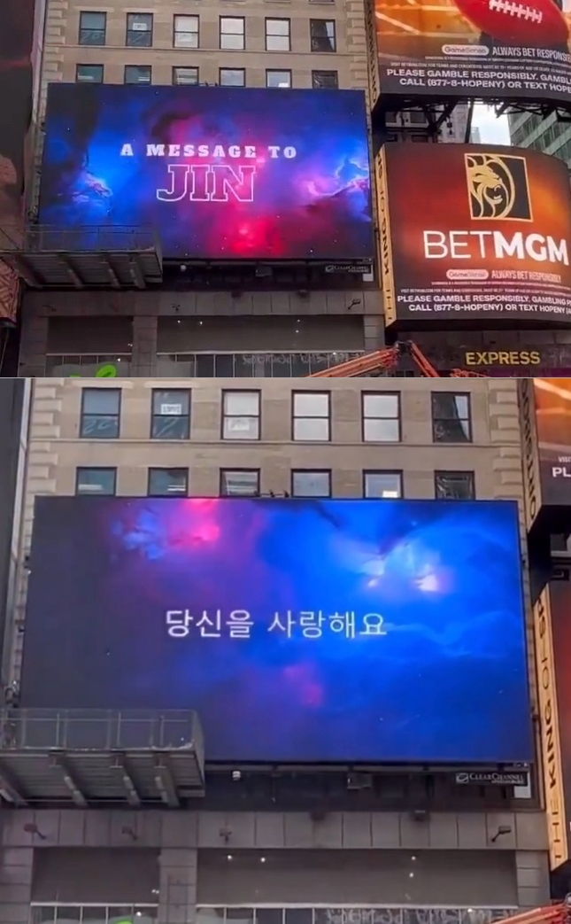 진의 글로벌 팬 베이스 All for Jin(@jinnieslamp)은 현지 시간 3일과 4일, 미국 뉴욕 타임 스퀘어에서 진의 생일 축하 영상 광고 서포트를 진행했다.