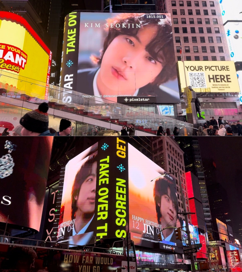 진의 미국팬 Kim Nasha BLOG(@NashaTriple)는 현지 시간 4일 진의 생일을 축하하며 뉴욕 타임 스퀘어에 영상 광고를 송출했다.
