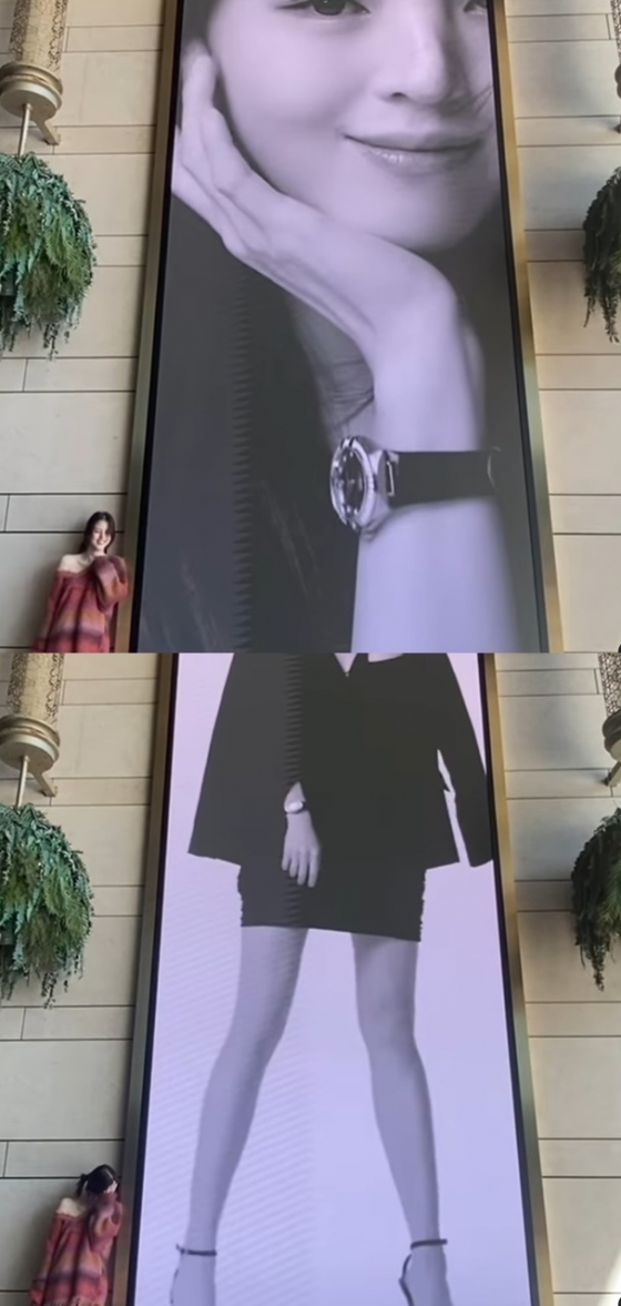 공개된 영상 속 한소희는 자신의 광고가 나오는 대형 스크린 앞에 서서 쑥스러운 듯 얼굴을 가린 채 미소 짓고 있다. 특히 흘러내린 니트 원피스 위로 드러난 새하얀 어깨와 가녀린 체구가 보는 이들의 보호 본능을 자극했다.