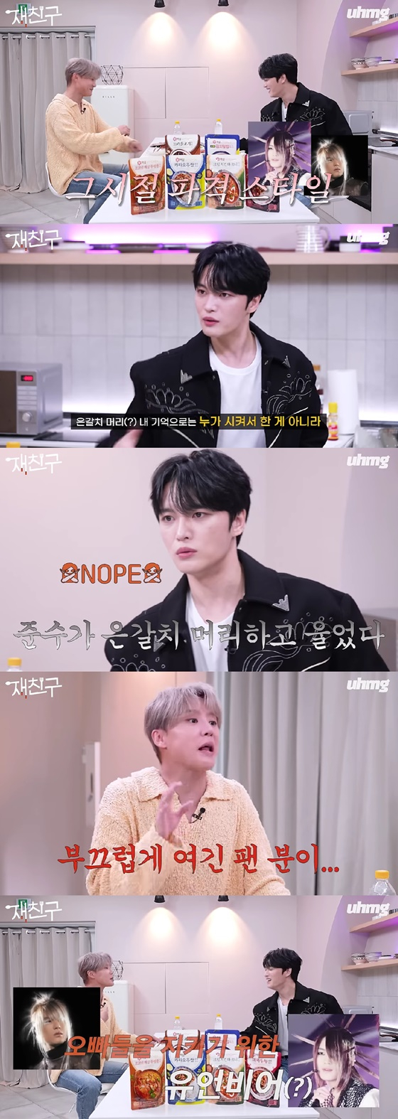 이에 김준수는 웃으며 "그렇다. 팬 분들이 듣고 싶어 하는 말을 하고 싶은 마음도 있지만, 그 당시 제가 은갈치 머리를 하고 울었다는 얘기도 있다더라"고 떠올렸고, 김재중은 "아니지 않냐"고 물었다.
