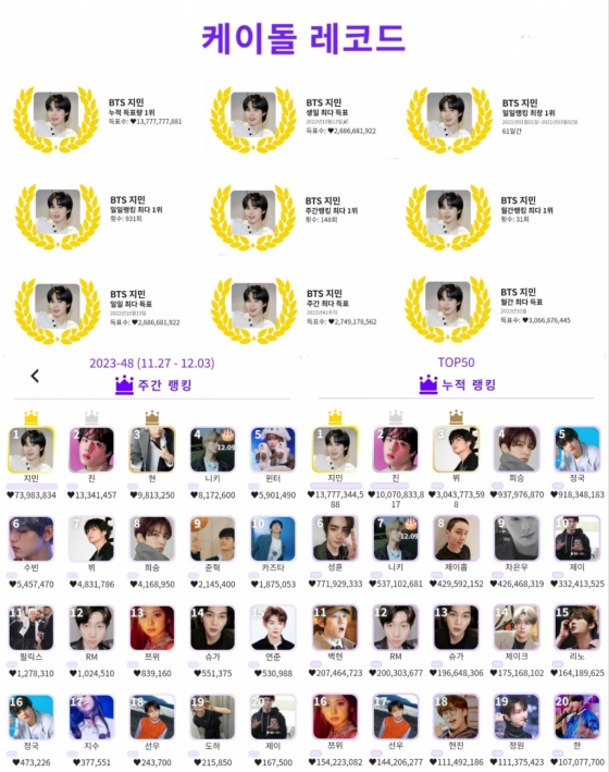 지민은 글로벌 K팝 인기투표 케이돌(KDOL)에서 11월 마지막 주(11월 27일 ~ 12월 3일) 집계 결과 총 7398만 3834개의 하트를 받아 주간 랭킹 1위를 기록했다.