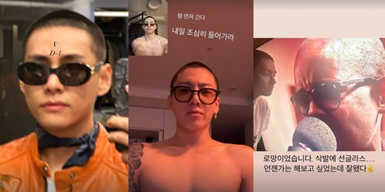 뷔는 입대 전날에는 삭발 사진을 공개하며 팬들의 아쉬움을 달랬다. 그는 "로망이었다. 삭발에 선글라스, 언젠가는 해보고 싶었는데 잘 됐다"며 선글라스를 쓴 삭발 사진을 자신 있게 공개했다. 또한 뷔는 자신처럼 짧은 머리를 하고 선글라스를 낀 정국과 영상통화를 나눈 순간을 팬들과 공유하기도 했다.