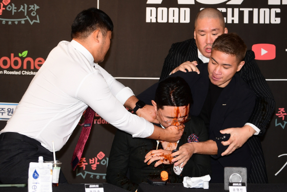 두 번째는 기자회견에서의 간장테러다. 지난달 22일 남산 서울타워에서 진행된 대회 공식 기자회견에서 쇼유 니키는 갑자기 일어나 윤형빈의 머리 위로 간장을 부어버렸다. 이 사건으로 기자회견은 아수라장이 됐다.