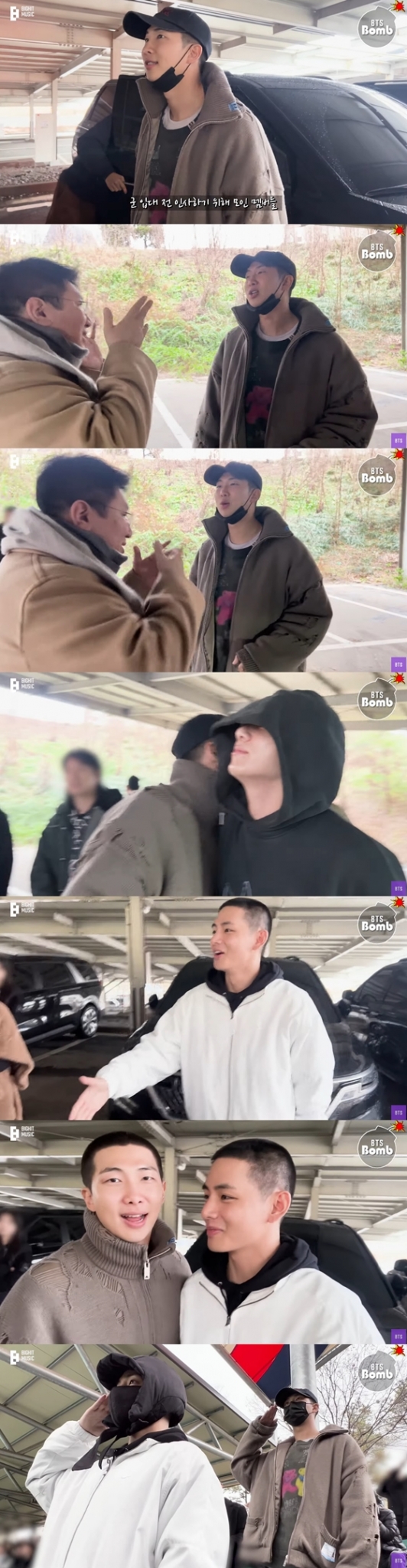 먼저, RM과 뷔의 논산훈련소 입소에는 지민, 정국 등 방탄소년단 멤버들이 동행했다. 이날 군 복무 중인 진, 제이홉 그리고 사회복무요원으로 대체복무 중인 슈가까지 함께 한 바 있다.