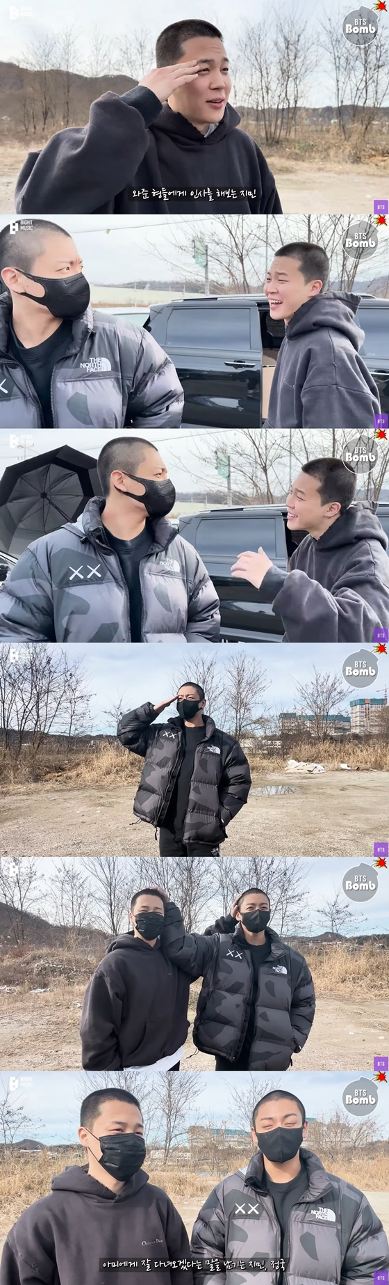 지민, 정국 입소식 날의 모습도 공개됐다. 정국과 지민은 서로의 머리를 만지는 모습을 사진으로 남겼다.