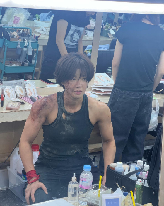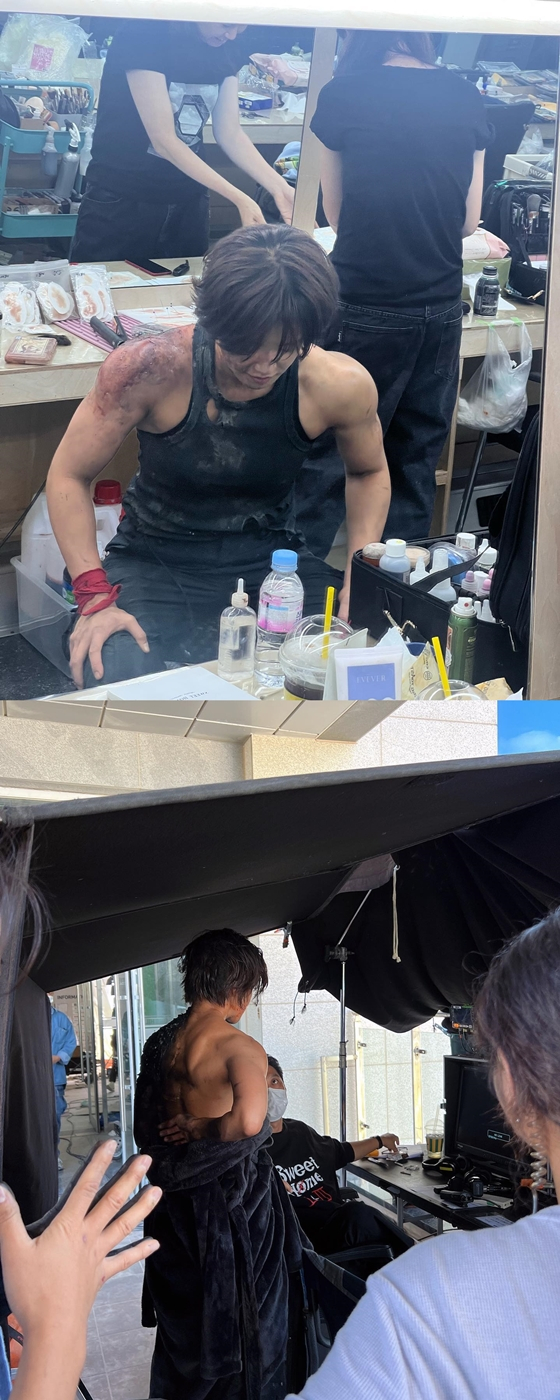 공개된 사진은 이시영의 촬영 분장 장면이 담겼다. 그는 떡 벌어진 어깨에 탄탄한 팔근육이 있다. 또 다른 사진에서는 성난 등 근육 일부까지 드러냈다. 특히 떡 벌어진 어깨는 일명 '어깨 깡패'를 연상케 할 정도.