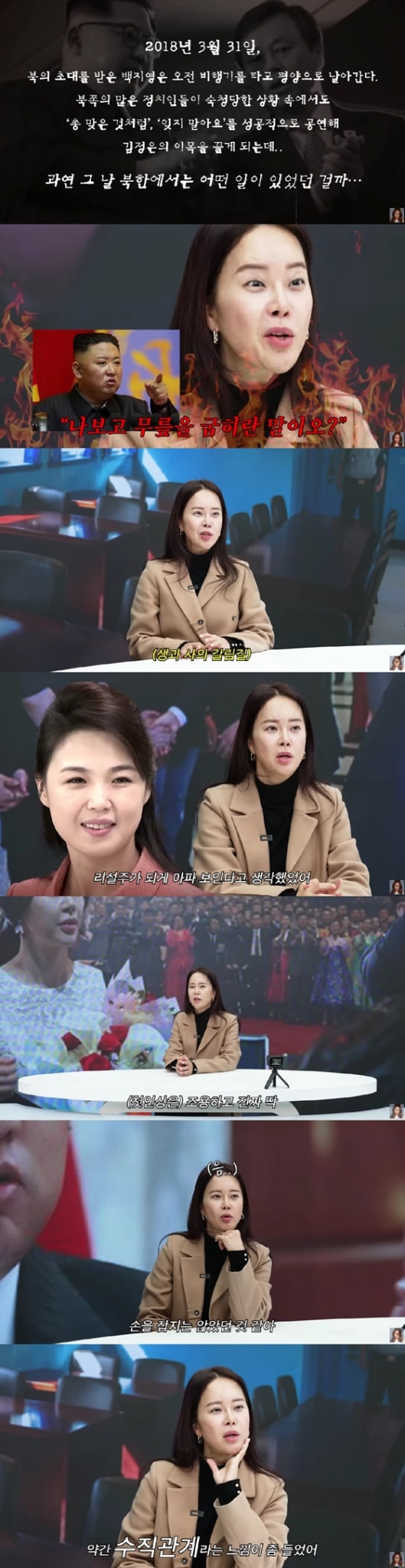 백지영은 김정은 위원장의 첫인상에 대해 "딱 봤을 때 현실감이 없었다. 만날 거라고 상상도 못 했다. 나는 말 한 번 잘못하면 아오지 탄광 끌려간다는 이야기를 듣고 자란 세대"라고 털어놨다.