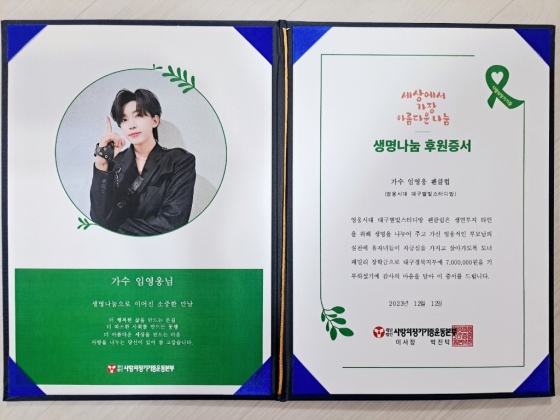 한편 '영웅시대 대구별빛스터디방'은 지난 6월에도 임영웅의 생일을 기념, 소아암 및 취약계층 환자들을 위한 의료비를 계명대학교 동산병원에 기부하는 등 임영웅의 선한 영향력 실천에 앞장서고 있다.