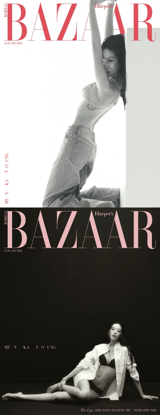 18일 패션 매거진 '하퍼스 바자'에서 배우 문가영과 함께한 2024년의 첫 번째 커버를 공개했다. 2가지의 흑백 커버로 언더웨어에 데님 팬츠 혹은 셔츠만 걸친 과감한 모습이 시선을 사로잡는다.