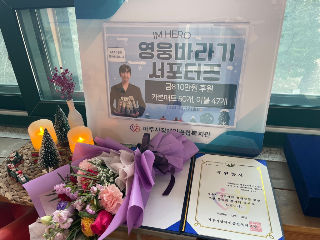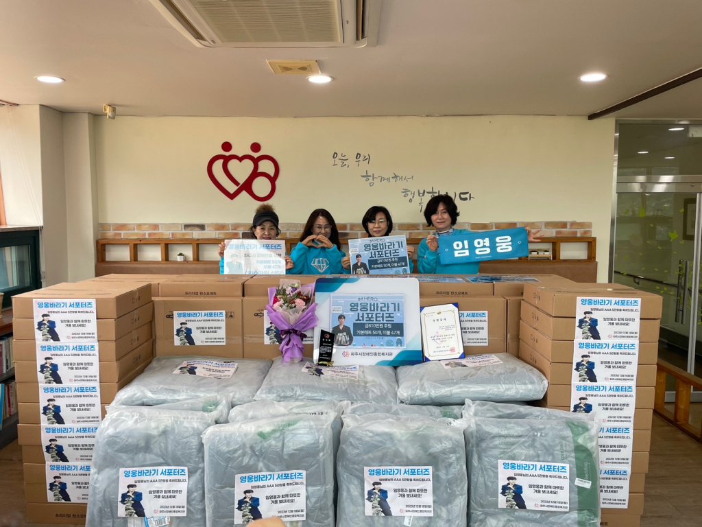 임영웅 팬클럽 '영웅바라기 서포터즈'는 임영웅의 2023 AAA 5관왕을 기념하고, 이웃에 사랑을 전하기 위해 파주시장애인종합복지관(관장 홍정숙)을 방문해 난방지원 후원품을 전달했다.