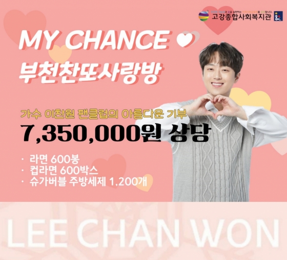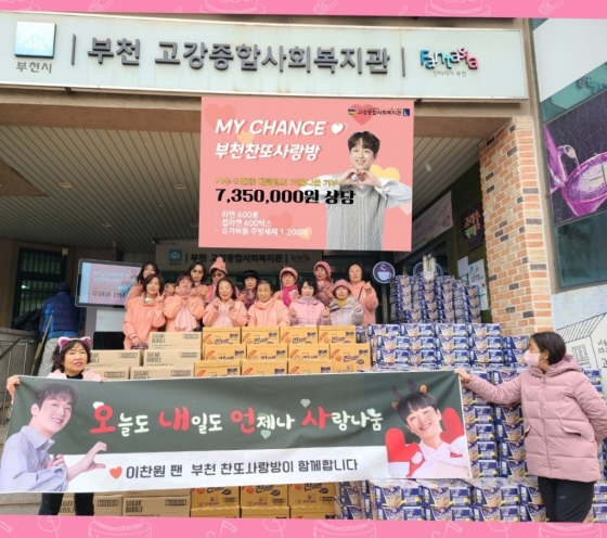 이찬원 팬클럽 '부천찬또사랑방'은 12월 19일 부천 고강종합사회복지관에 친환경 세제 '슈가버블' 1200개와 라면 600개, 컵라면 600상자 등 총 735만 원 상당의 생필품을 기탁했다.