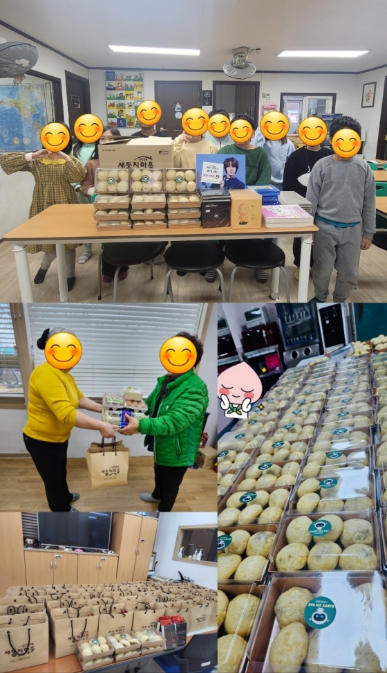 팬들은 연천지역 아동청소년센터에 율무쌀 찐빵, 진이 쓴 '한가닥'(한글·영어·일어) 책, 학용품, '디 애스트로넛'(The Astronaut) 앨범을 나눔 했다.