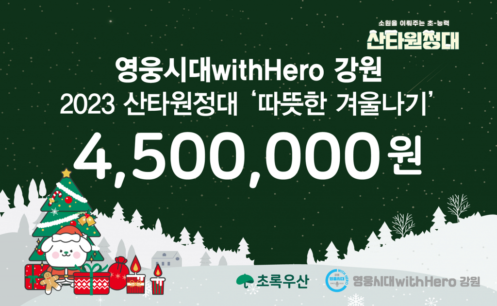'영웅시대 withHero 강원'은 임영웅의 선한 영향력에 동참하고자 초록우산 어린이재단 강원지역본부의 2023 산타원정대 '따뜻한 겨울나기'를 통해 누구보다 산타를 기다리는 아이들이 추운 겨울을 보다 따뜻하고, 건강하게 보낼 수 있도록 아이들의 미소가 더욱 빛날 수 있도록 난방비를 지원했다.