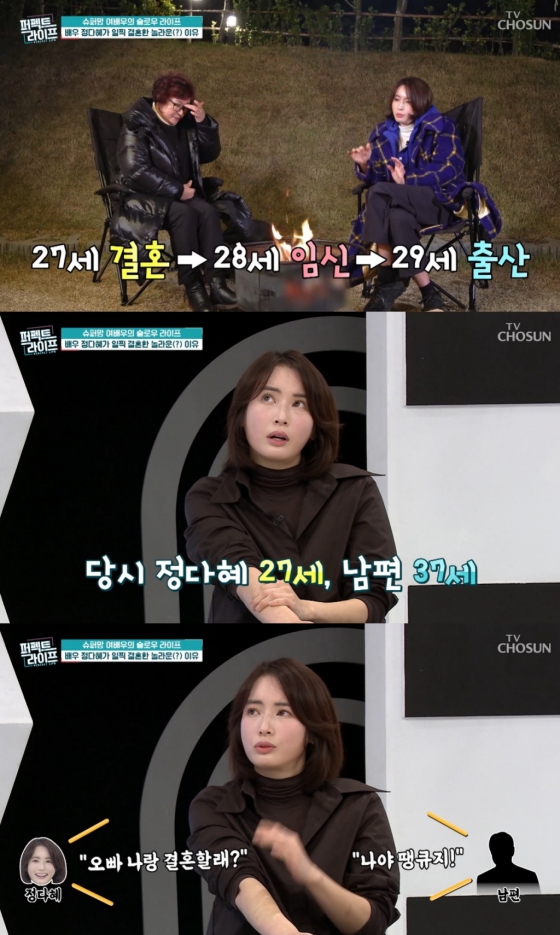 이외에도 정다혜는 "2011년 1월 연애를 했다. 당시 난 27세였고, 남자친구는 37세였다. 나랑 10세 차이가 나서 그냥 사귀다 헤어지면 이 남자를 노총각 만드는 거 아닌가 싶어서 '나랑 결혼할래?'라고 물었더니 '그럼 나야 땡큐지'라고 해서 결혼했다"라며 남자친구에게 자신이 먼저 청혼한 이유를 공개해 시청자들을 깜짝 놀라게 만들었다.