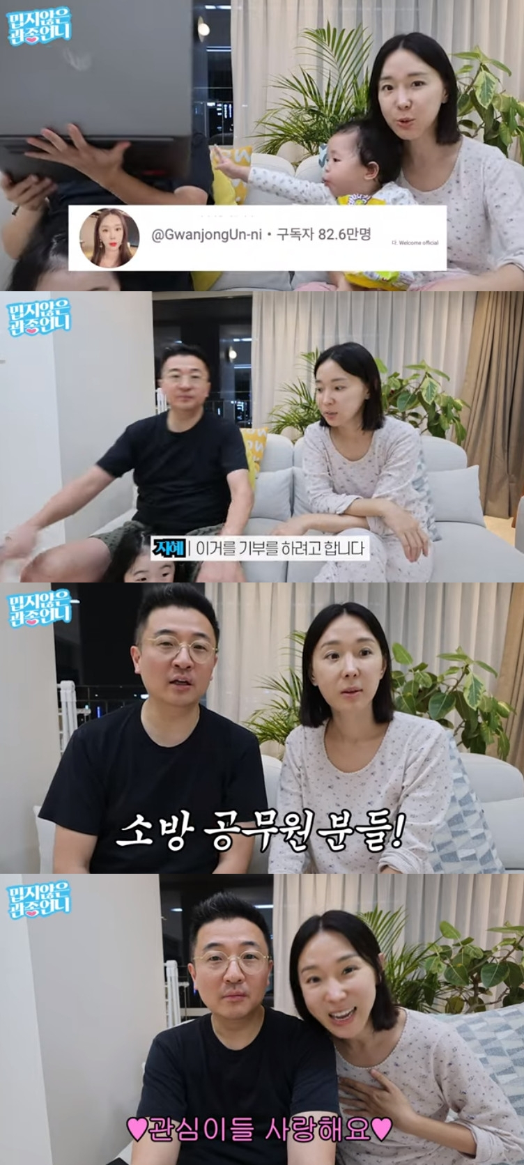 그러면서 이지혜 부부는 두 딸의 이름으로 천만 원씩, 또 소방 공무원들에게 3천만 원을 기부하겠다고 밝혔다. 문재완 씨는 "최근에 안타까운 사고도 있었고, 소방 공제회에 기부하면 어떨까 싶었다"고 했고, 이지혜는 "죽음의 위기에서 생명을 구하는 소방관분들 너무 존경스럽다"고 고마운 마음을 전했다.