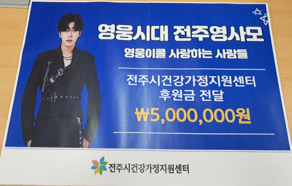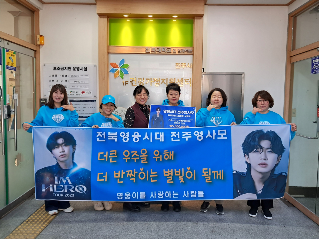 임영웅 팬클럽 전북영웅시대 전주영사모(영웅이를 사랑하는 사람들)는 12월 21일 전주시가정지원센터에 500만 원을 기부했다.