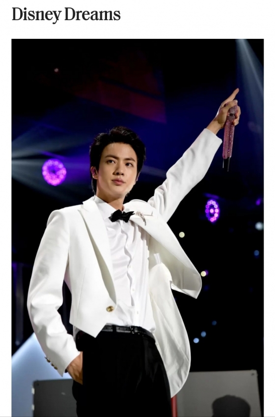 세번째는 디즈니의 꿈이라는 키워드가 등장했다. 매체는 진은 항상 아미들에게 디즈니 왕자와 같다고 칭송받아 왔는데 진이 화이트 착장을 하면 자연적으로 동화속 인물이 연상된다고 전했다.