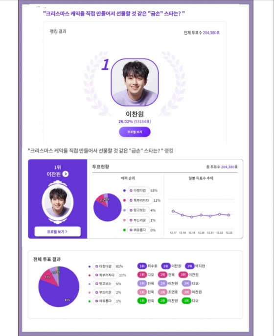 가수 이찬원이 크리스마스 케이크를 직접 만들어 선물할 스타 1위에 오르며 인기를 입증했다.