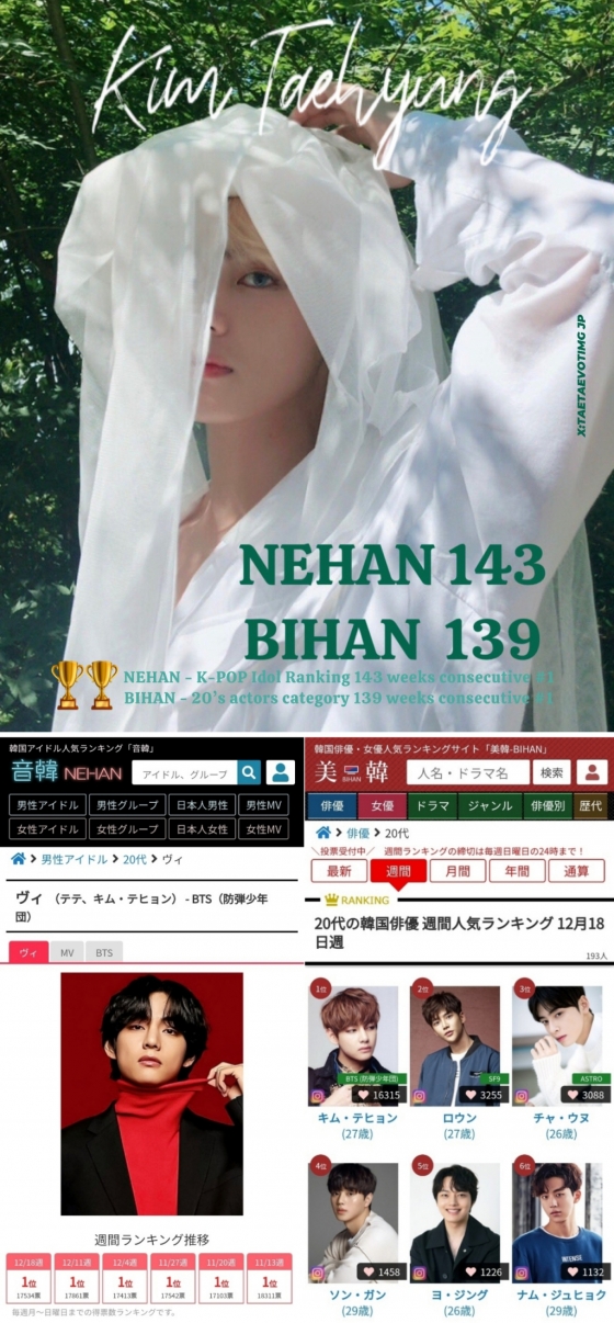 뷔는 12월 18일부터 12월 24일까지 일본 인기 아이돌 랭킹 사이트 '네한'(NEHAN)이 실시한 K팝 남자 아이돌 랭킹 투표에서 1위를 차지하면서 143주 연속 1위의 대기록을 세웠다.