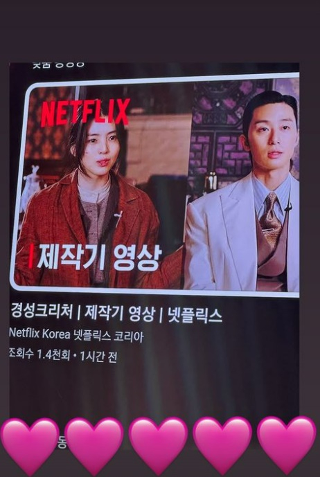한소희는 26일 자신의 유튜브 맞춤 동영상에 뜬 '경성크리처 제작기 영상'을 캡처해 추천하는 게시물을 올렸다.