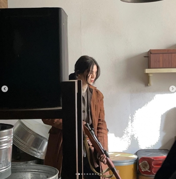 한소희는 사진 속 윤채옥 역으로 분해 우아한 자태를 선보이는 한편 장총을 들고 벽을 타는 고난이도의 액션을 선보이기도 했다.