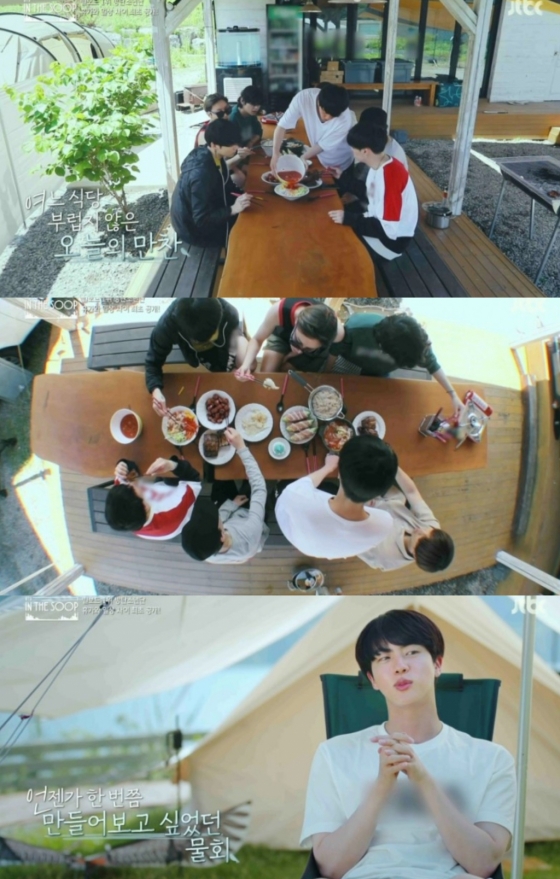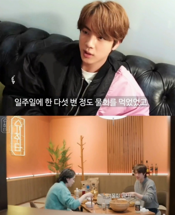 멤버들을 위해 자주 요리를 하는 진은 지난 2020년 방송된 JTBC '인더숲 BTS편(In the SOOP BTS ver.)'에서도 직접 물회를 만들며 다정한 면모를 드러냈다. 직접 생선을 손질하고 육수를 부어 물회를 완성한 진은 다인분의 물회를 만들게 돼 맛이 떨어질까봐 걱정했지만 멤버들은 크게 만족하며 맛있게 먹는 모습을 보였다.