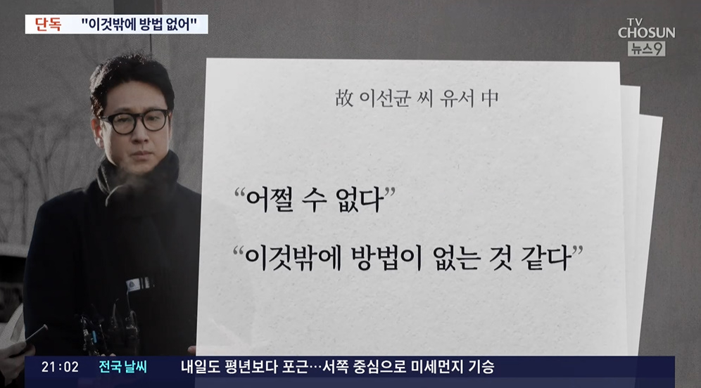 특히 이선균의 유서는 유족들의 요청에 의해 공개되지 않고 있다고 알려졌지만, 27일 오후 TV조선 '뉴스9'을 통해 "'이것밖에 방법 없어'...'거짓말 조사' 자청"이라는 제목으로 단독 보도했다. TV조선 측은 "어젯밤 집을 나서기 전 이선균은 유서 형식의 메모를 남겼다. 아내에겐 '어쩔 수 없다', '이것 밖에 방법이 없는 것 같다'는 취지로 말했다"라고 밝혔다.