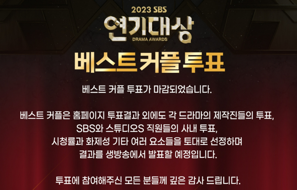 SBS는 지난 18일 오전 9시부터 27일 오후 1시까지 '2023 연기대상' 공식 홈페이지를 통해 베스트 커플 투표를 실시했다.