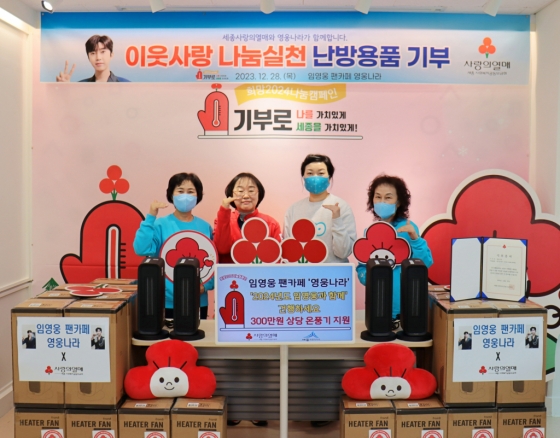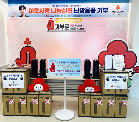 임영웅 팬클럽 영웅나라는 임영웅 2023 전국투어 콘서트 'IM HERO' 대전 공연을 응원하며 12월 28일 사랑의열매 세종사회복지공동모금회에 308만 원 상당 전기온풍기 35대를 기부했다.
