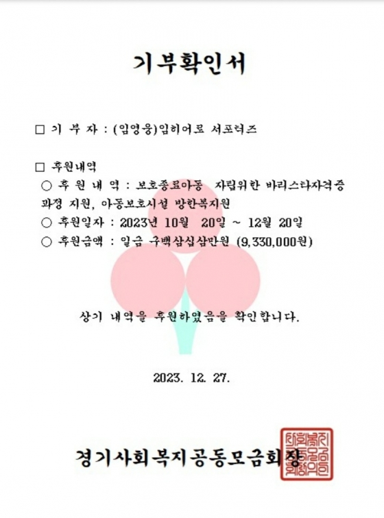 임영웅 팬클럽 ' 임히어로서포터즈'는 12월 27일 사랑의열매 경기사회복지공동모금회를 통해 933만 원을 기부했다.