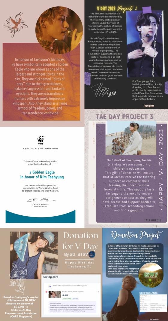 뷔의 영국 팬베이스 '뷔 프로젝트'(BTS V Projects)는 3가지 기부 프로젝트를 진행한 가운데 첫 번째로 자연 보호를 위해 설립된 세계 최대 규모의 국제 비정부 기구 'WWF'(세계자연기금)로부터 검독수리를 입양했다.