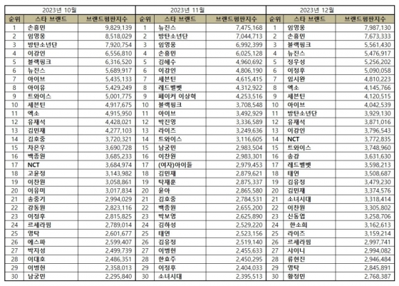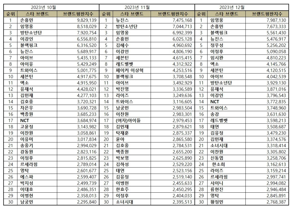 2023년 12월 스타 브랜드평판 30위 순위는 임영웅, 손흥민, 블랙핑크, 뉴진스, 정우성, 이정후, 임시완, 엑소, 세븐틴, 아이브, 방탄소년단, 유재석, 이강인, NCT, 트와이스, 송강, 레드벨벳, 태연, 김유정, 김민재, 소녀시대, 이찬원, 신동엽, 한소희 , 라이즈, 르세라핌, 샤이니, 류현진, 영탁, 황정민 순으로 분석됐다.