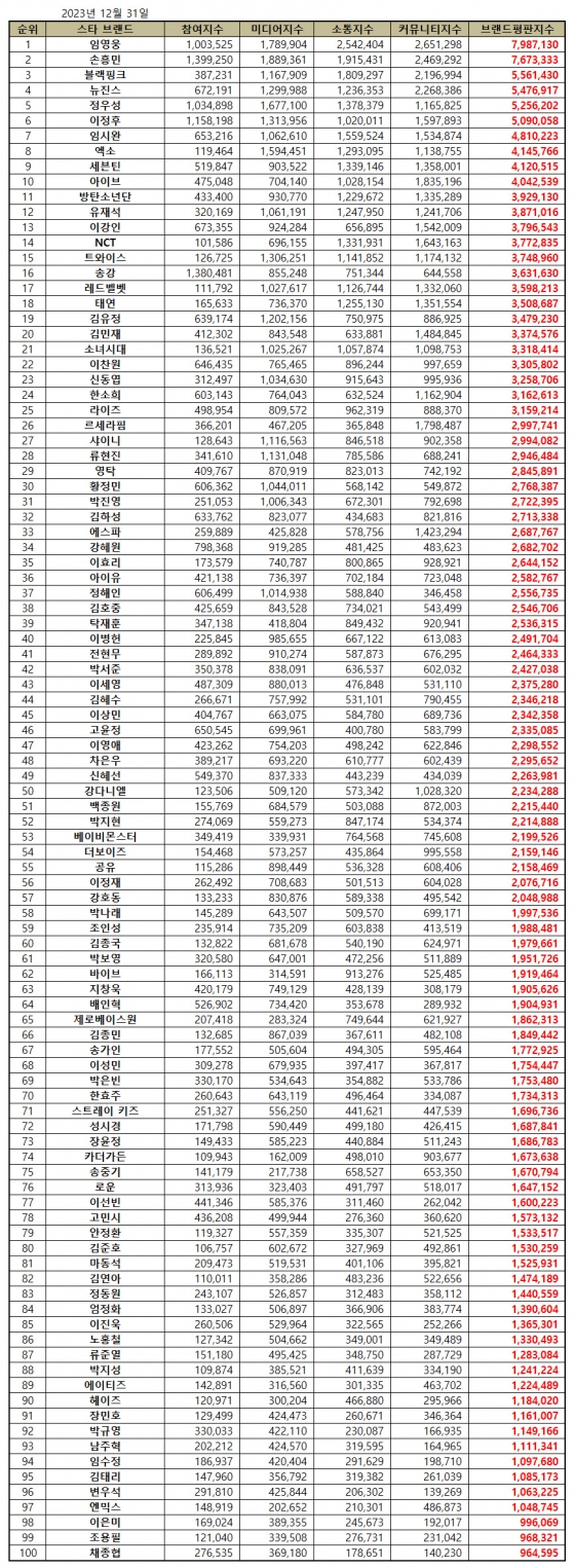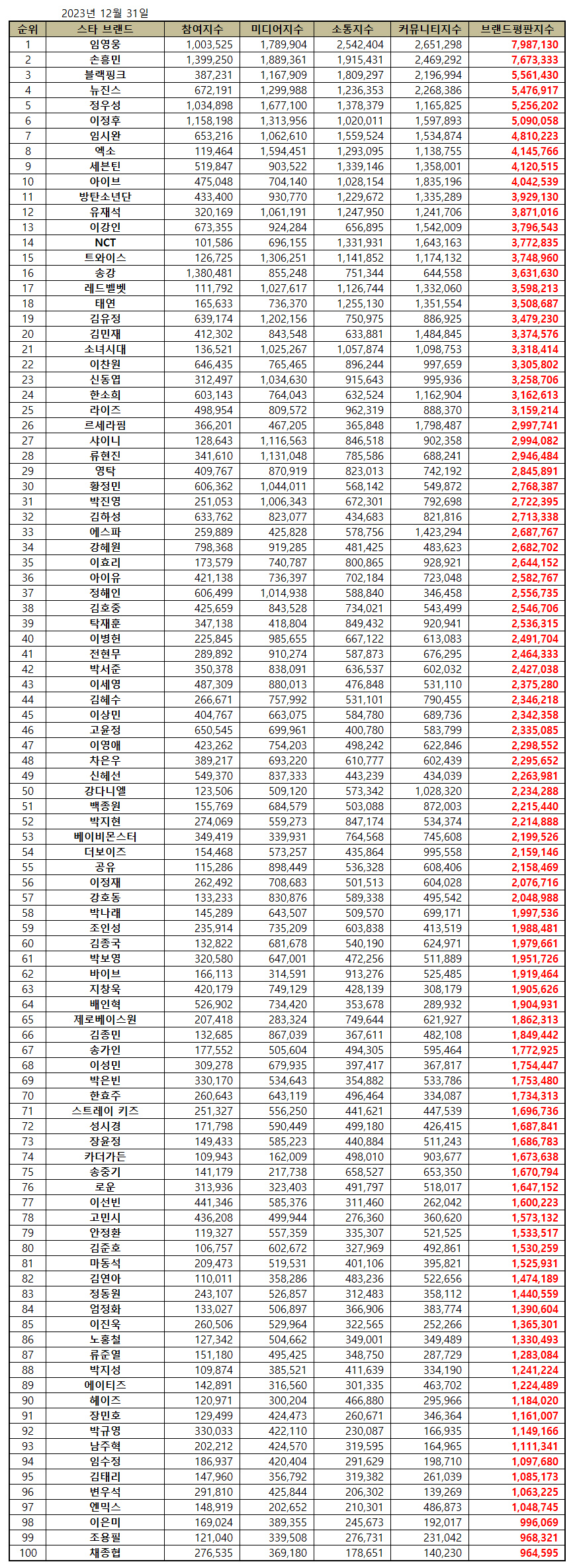스타 브랜드평판 2023년 12월 빅데이터 분석 100위는 임영웅, 손흥민, 블랙핑크, 뉴진스, 정우성, 이정후, 임시완, 엑소, 세븐틴, 아이브, 방탄소년단, 유재석, 이강인, NCT, 트와이스, 송강, 레드벨벳, 태연, 김유정, 김민재, 소녀시대, 이찬원, 신동엽, 한소희 , 라이즈, 르세라핌, 샤이니, 류현진, 영탁, 황정민, 박진영, 김하성, 에스파, 강혜원 , 이효리, 아이유, 정해인, 김호중, 탁재훈, 이병헌, 전현무, 박서준, 이세영, 김혜수, 이상민, 고윤정, 이영애, 차은우, 신혜선, 강다니엘, 백종원, 박지현, 베이비몬스터, 더보이즈, 공유, 이정재, 강호동, 박나래, 조인성, 김종국, 박보영, 바이브, 지창욱, 배인혁, 제로베이스원, 김종민, 송가인, 이성민, 박은빈, 한효주, 스트레이 키즈, 성시경, 장윤정, 카더가든, 송중기, 로운, 이선빈, 고민시, 안정환, 김준호, 마동석, 김연아, 정동원, 엄정화, 이진욱, 노홍철, 류준열, 박지성, 에이티즈, 헤이즈, 장민호, 박규영, 남주혁, 임수정, 김태리, 변우석, 엔믹스, 이은미, 조용필, 채종협 순으로 분석됐다.