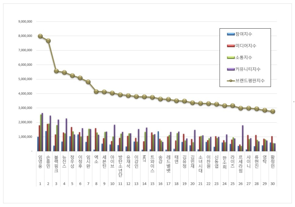 1위 임영웅 브랜드는 참여지수 1,003,525 미디어지수 1,789,904 소통지수 2,542,404 커뮤니티지수 2,651,298이 되면서 브랜드평판지수 7,987,130으로 분석됐다. 지난 12월 브랜드평판지수 6,992,399와 비교해보면 14.23% 상승했다.