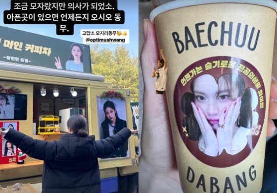 공개된 사진에는 가수 겸 배우 황민현이 선물한 커피차 앞에 선 고윤정의 모습이 담겨 있다. 고윤정은 황민현이 보내준 커피차 앞에서 양팔을 벌리며 기쁨을 드러냈다.