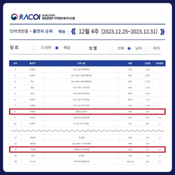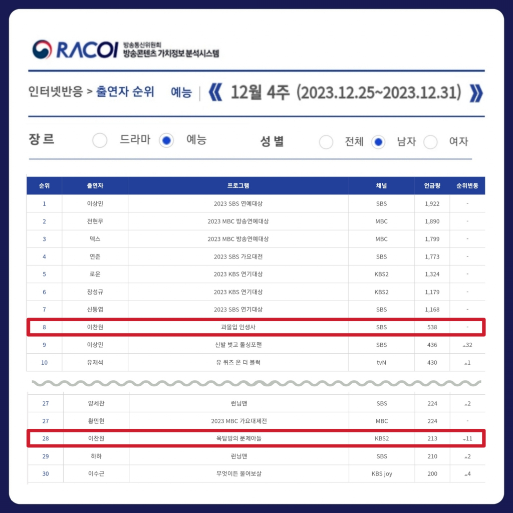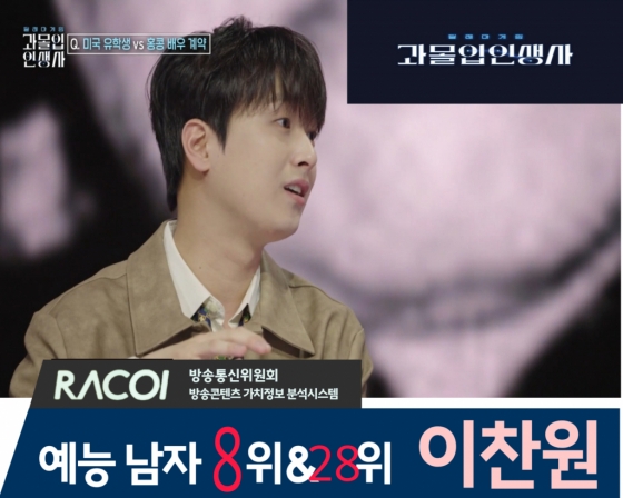 방송통신위원회 방송콘텐츠 가치정보 분석 시스템 RACOI에 따르면, 이찬원은 12월 4주(12월 25일~12월 31일) 인터넷 반응 분석에서 SBS TV '과몰입 인생사'로 남성 예능 출연자 8위와 KBS 2TV '옥탑방의 문제아들'로 28위를 각각 차지했다.