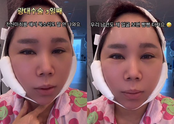 또 "기관지 삽입을 해서 아직 목이 아프다. 평소 가래가 안 나오는데 가래도 많이 나온다. 제가 원하는 45도 광대를 위해 살짝 넣었다. 꼴이 말이 아니다. 입을 벌리지 못해서 매일 죽 먹고 입 안에 실밥이 있다"고 설명했다.