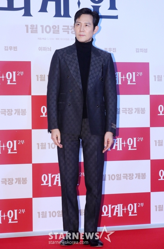 배우 이정재가 5일 오후 서울 용산구 아이파크몰 CGV에서 진행된 영화 '외계+인 2부' VIP시사회에 참석해 포즈를 취하고 있다.