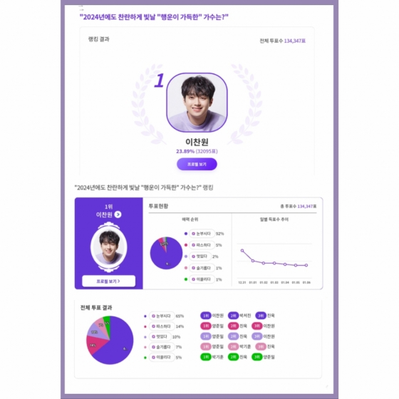 이찬원은 12월 30일부터 1월 6일까지 익사이팅 디시에서 진행된 '2024년에도 찬란하게 빛날 '행운이 가득한' 스타는?' 설문에서 1위를 차지했다.
