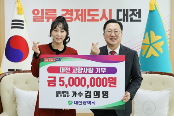 김의영은 소속사를 통해 "고향인 대전의 발전에 도움이 되길 바라는 마음으로 홍보대사로 활동해왔는데 고향사랑기부제를 통해 행복을 나눌 수 있어 기쁘다. 앞으로도 지역 발전에 이바지하는 마음으로 대전을 알릴 수 있도록 노력하겠다"고 소감을 전했다.