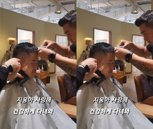 영상에는 입대를 위해 머리를 깎고 있는 정지웅 군의 모습이 담겼다.