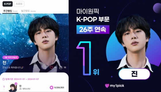 진은 마이원픽 'K-POP 부문' 1월 1주차(1월1일~1월 7일) 투표에서 932만 4353개의 하트를 얻어 주간랭킹 1위를 차지, 26주 연속 1위를 기록하며 독보적인 인기를 과시했다