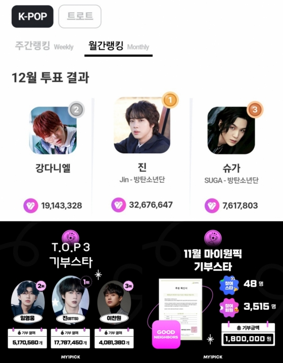 진은 앞서 마이원픽 'K-POP부문' 23년 12월 한달간 총 하트수 3267만 6647개를 얻어 '12월 월간랭킹' 1위에 올랐다.
