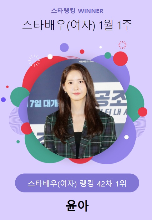 윤아는 1월 4일 오후 3시 1분부터 1월 11일 오후 3시까지 진행된 1월 1주(42차) 스타랭킹 스타배우 여자 랭킹 투표에서 1만 5525표를 얻으며 1위에 랭크됐다.